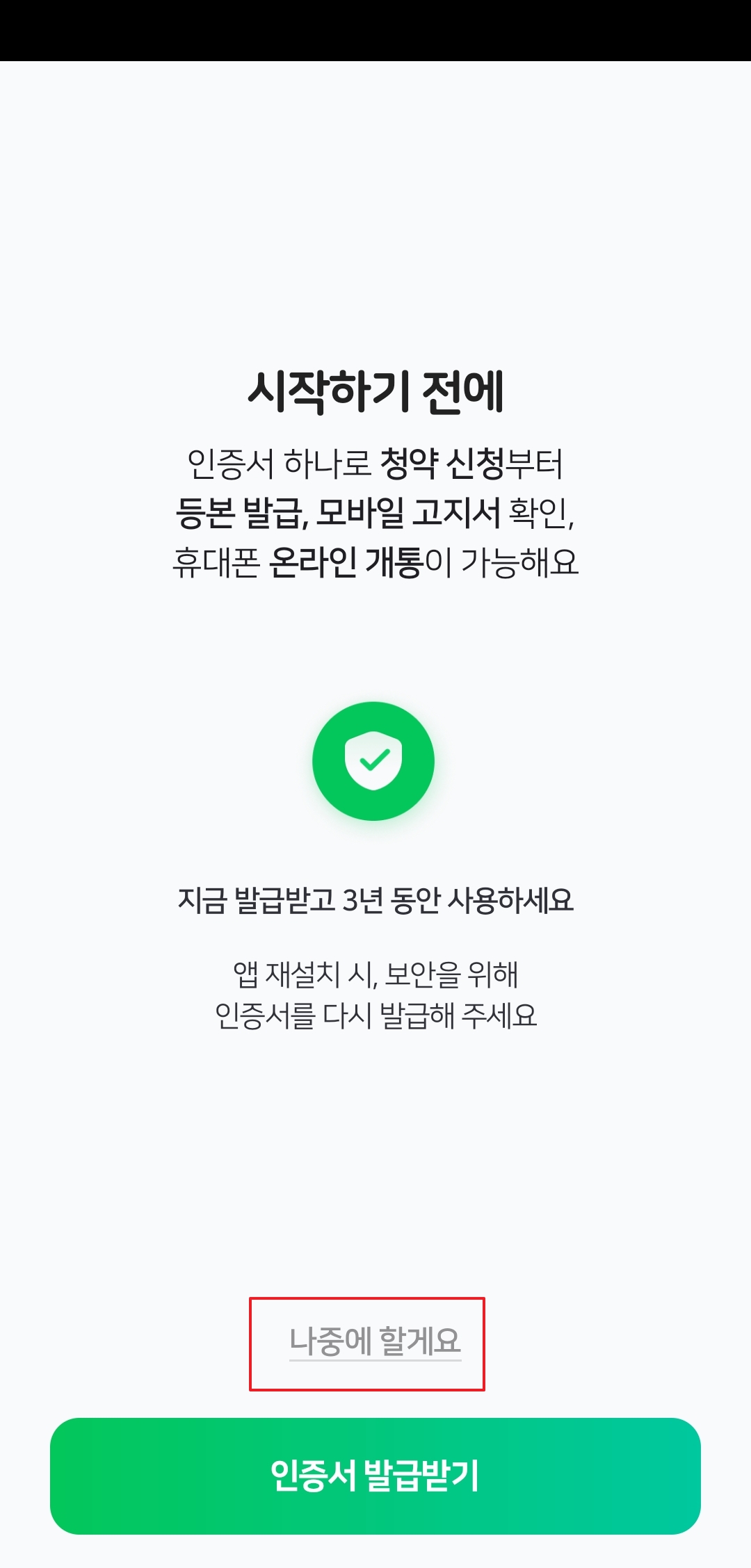 이어서 뭐 인증서나 페이 같은 추가 기능에 대한 안내가 나올 수도 있는데요. 지금 당장 꽃 검색만 할 거라면 굳이 설정할 필요 없어요. '나중에 하기' 같은 버튼을 눌러서 넘어가시면 됩니다.