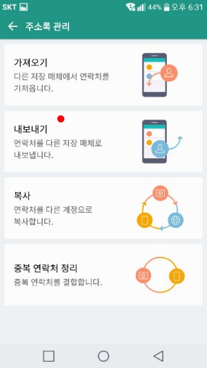'주소록 관리'로 들어오셨으면 '연락처 가져오기/내보내기' 메뉴를 찾으시면 돼요. 우리는 컴퓨터로 옮길 거니까 당연히 '내보내기'를 선택해야겠죠? 이걸 누르면 어디에 저장할 건지 물어볼 거예요.