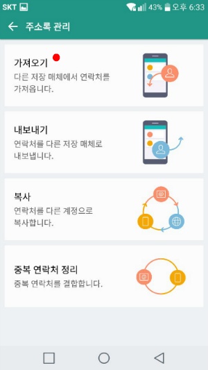 {"alt":"연락처 가져오기 및 파일 선택 화면"} 연락처를 옮기다 보면 이름은 같은데 번호가 다르거나, 번호는 같은데 이름이 다르게 저장돼서 중복되는 경우가 생기더라고요. 그럴 땐 '주소록 관리'에 있는 '중복 연락처 정리' 기능을 써보시는 게 좋아요.