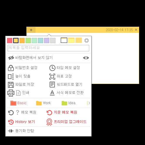 메모장 기본 기능도 아주 탄탄해요. 메모지 색깔을 마음대로 바꿀 수 있어서 용도별로 구분하기 좋고요. 메모마다 비밀번호를 걸어둘 수도 있어서 중요한 내용은 잠가놓을 수도 있어요.