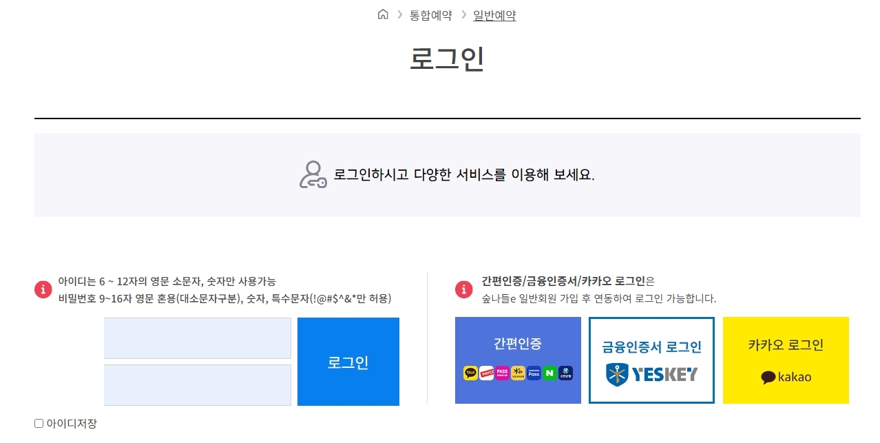 마음에 드는 방을 골라서 '예약하기'를 누르면, 아마 로그인을 하라고 나올 거예요. 숲나들e 회원가입이 되어 있으시면 아이디/비번으로 로그인하시면 되고요.