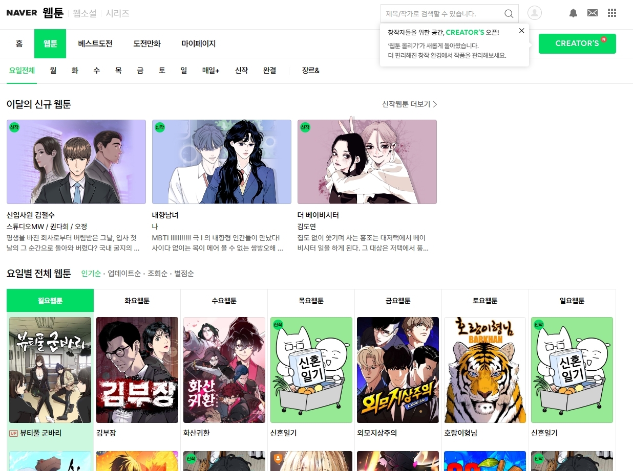 페이지에 들어오면 요일별로 연재 중인 수많은 작품들이 눈을 사로잡는데요. 월요일부터 일요일까지 매일 업데이트되는 작품들이 다르기 때문에, 내 취향에 맞는 그림체나 스토리를 골라 잡는 재미가 쏠쏠합니다.