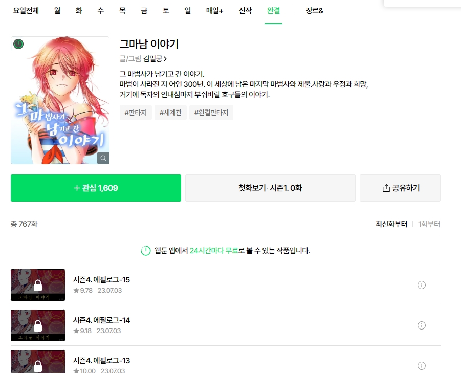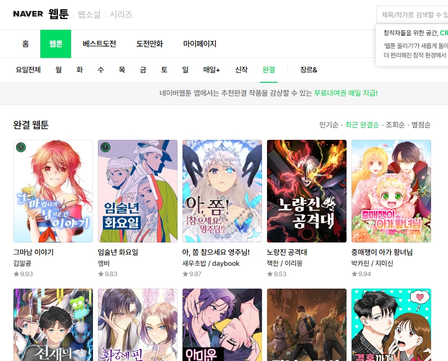 완결작은 보통 유료로 전환되지만, 네이버에서는 독자들을 위해 하루에 한 편씩 무료 이용권을 지급해 주는 시스템을 운영하고 있거든요. 이걸 잘 활용하면 돈 한 푼 안 쓰고도 장편 대서사시를 정주행할 수 있습니다.