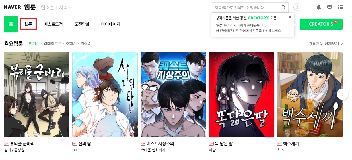 이 메뉴를 클릭하면 본격적으로 만화들이 모여 있는 전용 페이지로 이동하게 됩니다. 모바일 앱을 설치하지 않아도 웹 브라우저 상에서 바로 감상이 가능하니까, 회사나 공용 PC에서 잠깐 짬을 내어 볼 때도 아주 유용하더라고요.