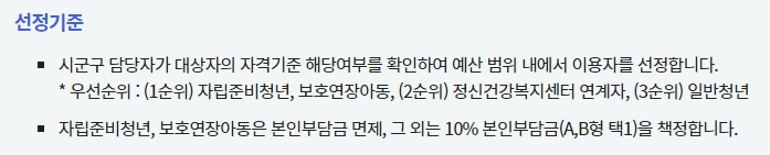 신청 전에 반드시 꼼꼼하게 읽어봐야 할 것이 바로 '지원대상'과 '선정기준' 탭입니다. 제목만 보고 "나도 해당되겠지" 싶어서 무작정 신청했다가, 소득 기준이나 가구 특성 때문에 탈락하는 경우가 은근히 많거든요.