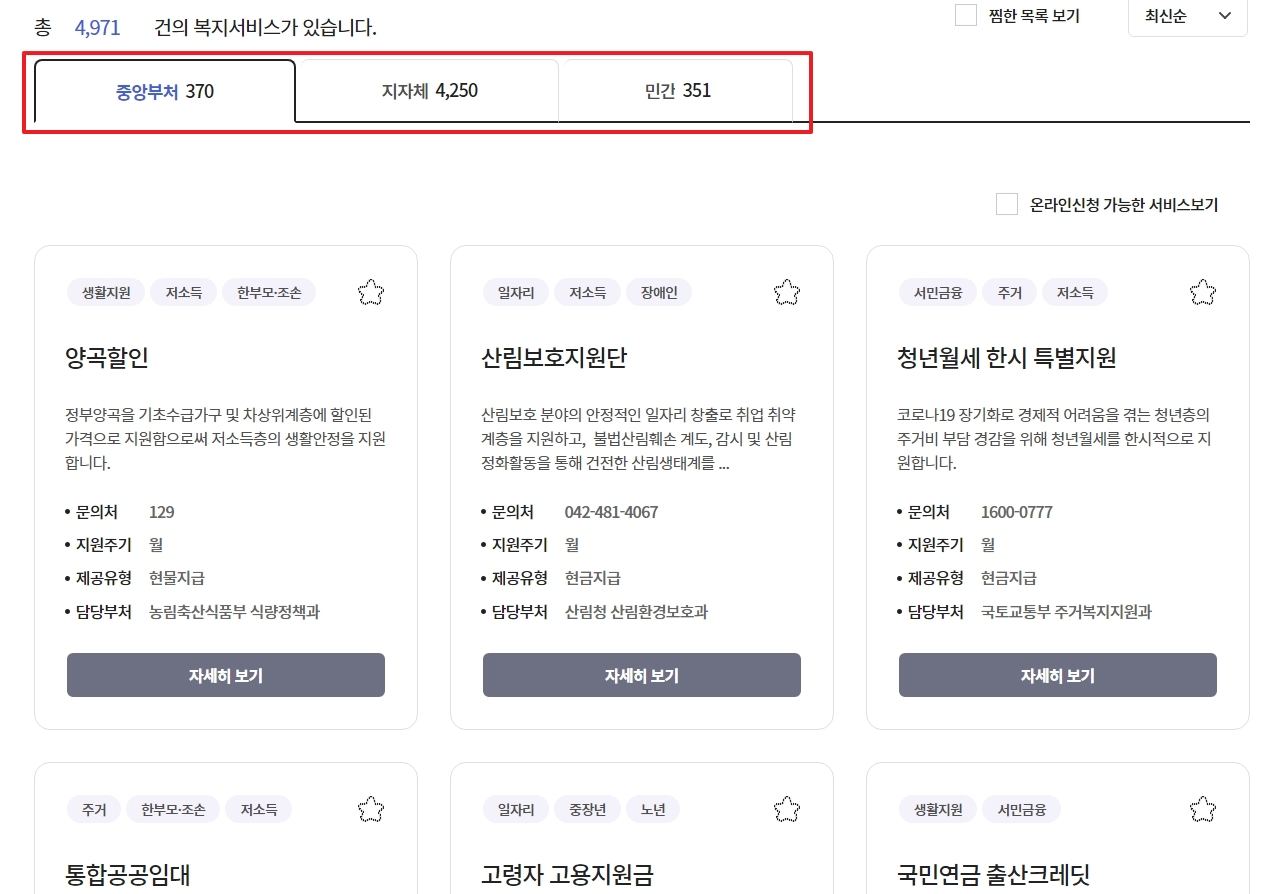 이렇게 들어가면 단순히 인기 있는 항목뿐만 아니라, 현재 정부와 지자체에서 시행 중인 모든 지원 사업을 꼼꼼하게 필터링해서 찾아볼 수 있습니다. 내가 미처 알지 못했던 혜택을 발견하기에는 이 방법이 가장 좋더라고요.