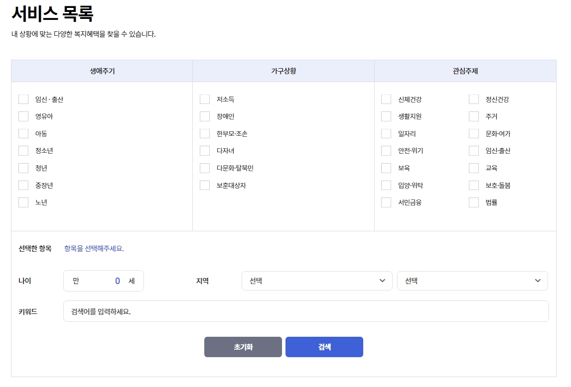 - 생애주기: 청년, 중장년, 노년 등 본인의 연령대 선택