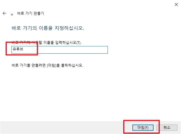 이제 아이콘의 이름을 지어줄 차례입니다. 기본적으로 '새 인터넷 바로 가기'라고 되어 있을 텐데, 우리가 알아보기 쉽게 'YouTube'나 '유튜브'로 바꿔주시는 게 좋겠죠?