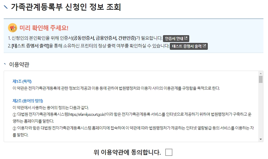 메뉴를 누르면 이용 약관 동의 페이지가 나옵니다. 필수 항목에만 체크하고 넘어가시면 되는데요. 이때 테스트 증명서 출력 팝업이 뜰 수 있는데, 프린터가 없어도 화면 열람만으로도 확인이 가능하니 걱정하지 않으셔도 돼요.