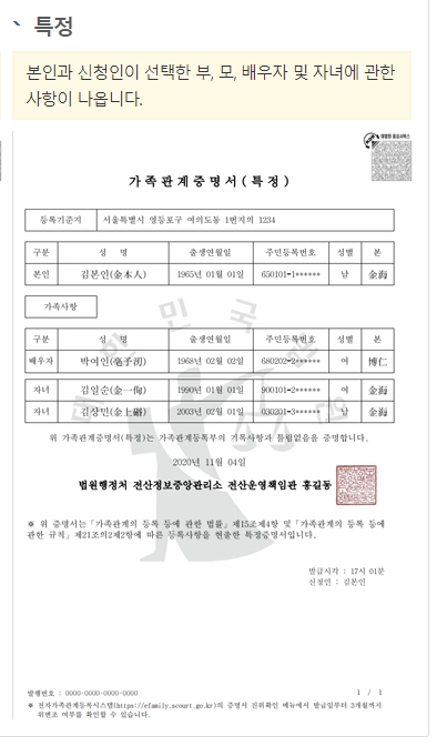 신청하기 버튼을 누르면 증명서가 화면에 나타납니다. 문서의 내용을 꼼꼼히 읽을 필요 없이, 가장 맨 윗줄의 [등록기준지] 칸을 보시면 됩니다.