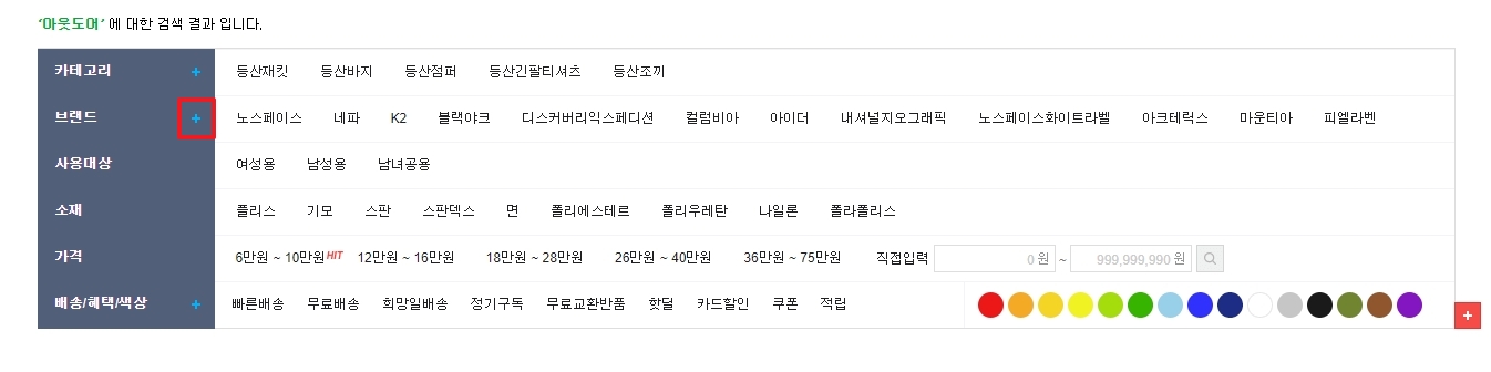 검색 결과 화면을 보시면 카테고리나 가격대 같은 필터가 보이실 거예요. 여기서 중요한 건 '브랜드' 항목 옆에 있는 더보기 버튼(+)을 누르는 건데요. 이걸 은근히 모르고 지나치는 분들이 많으시더라고요.