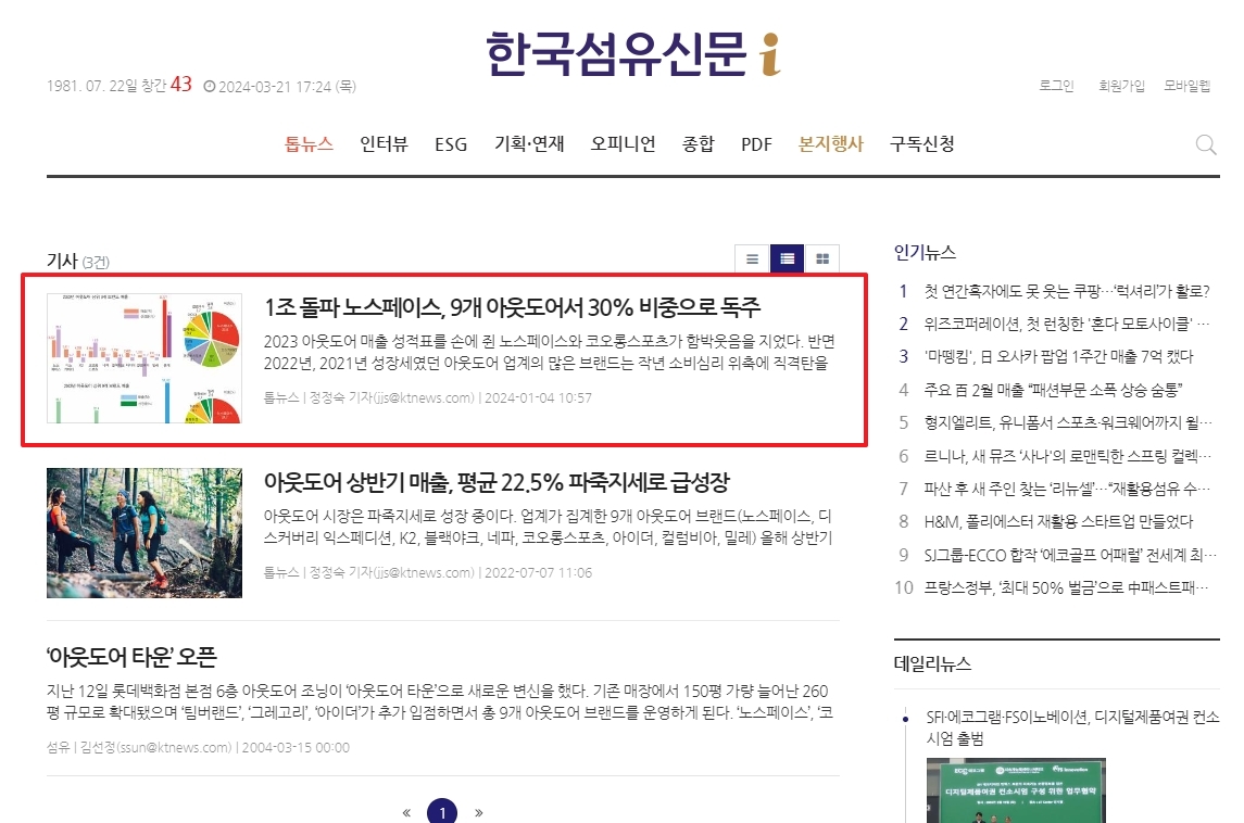 아웃도어 브랜드 순위 정보를 정확하게 파악하려면 카더라 통신보다는 공신력 있는 자료를 확인하는 게 중요해요. 보통 섬유 패션 전문 매체에서 데이터를 집계하는데, 여기 들어가 보시면 의류나 산업별로 아주 디테일한 매출 수치를 제공하거든요. 저도 시장 흐름을 볼 때 자주 참고하는 편이에요.