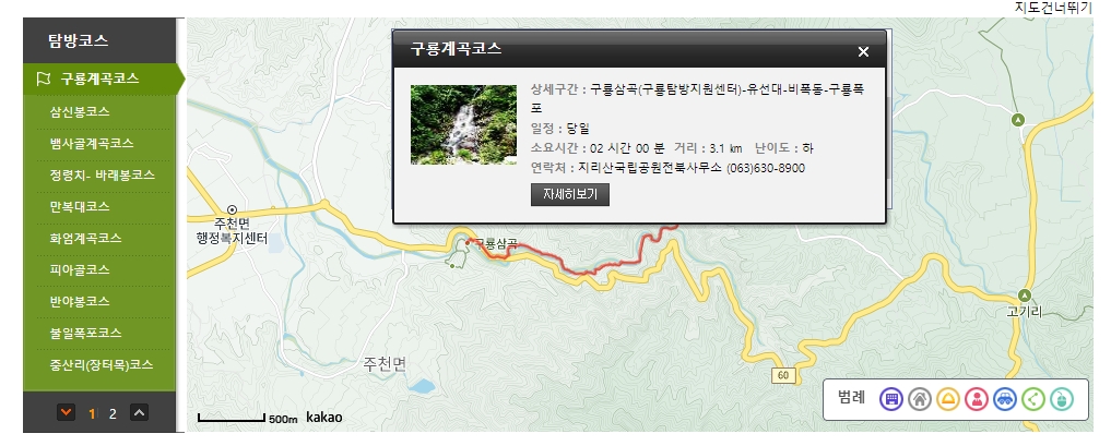 {"alt":"지리산 등산 코스의 다양한 자연 풍경과 탐방로"} 구룡계곡 코스는 북부 사무소에서 관리하는 곳인데, 산수가 수려해서 걷는 내내 감탄이 절로 나오는 곳이에요. 탐방지원센터에서 폭포까지 왕복 3.1km 정도 되는데, 쉬엄쉬엄 다녀오면 2시간 정도 걸려서 부담 없이 다녀오기 딱 좋더라고요. 경사가 심하지 않은 편이라 가벼운 트레킹을 원하시는 분들에게 강력 추천드려요.